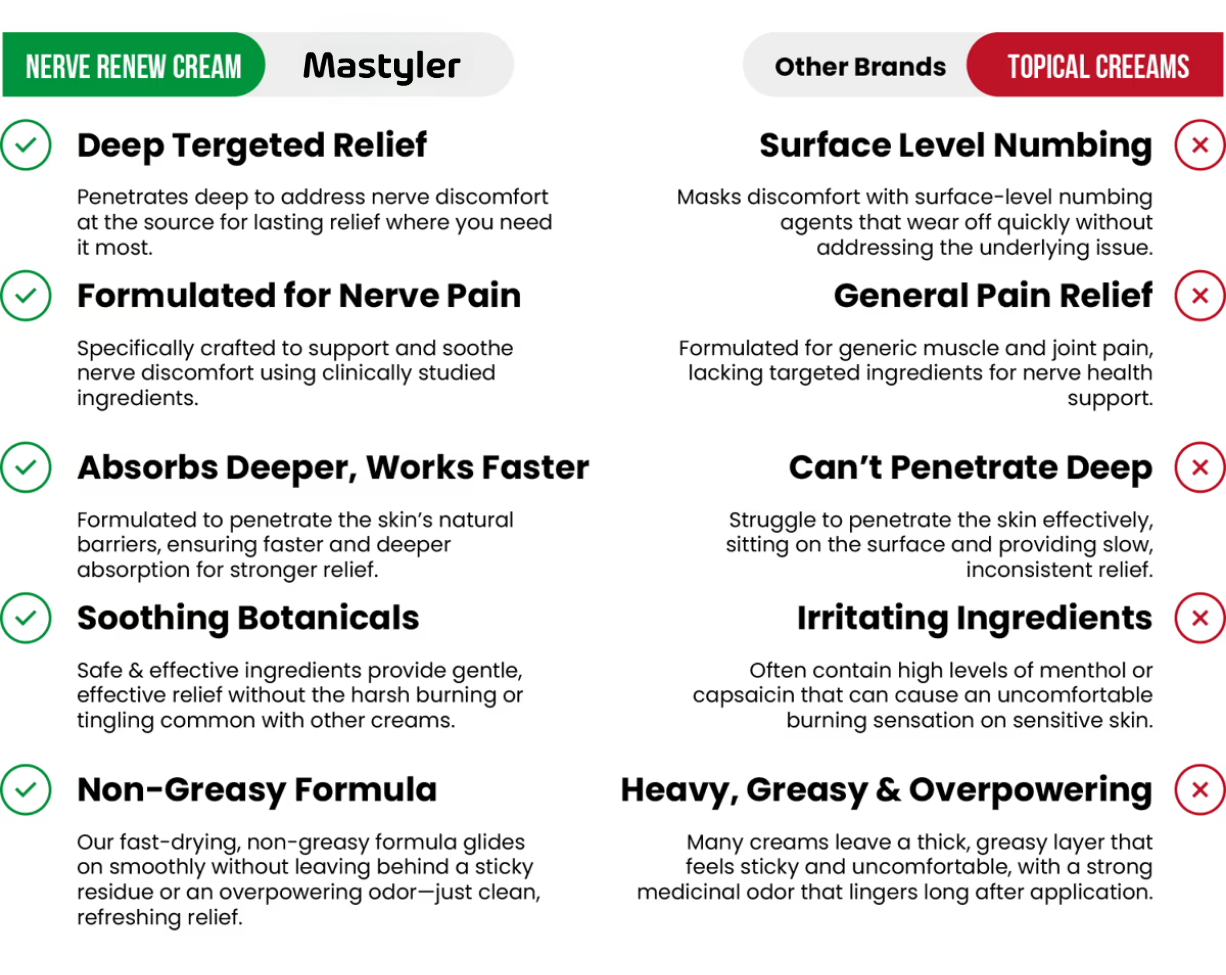 Now with 50% more menthol, our enhanced formula provides full strength relief - so you can live life to its fullest. Plus, experience the benefits of 30+ proven ingredients that work together to calm nerve discomfort & soothe irritation. Try Mastyler Cream today and discover for yourself why our customers love its powerful, fast-acting results. Step into a world where pain no longer holds you back. Mastyler Cream brings you the joy of relief and the peace of mind of living life without the constant interruption of nerve discomfort. Here are just a few of the benefits that await you…