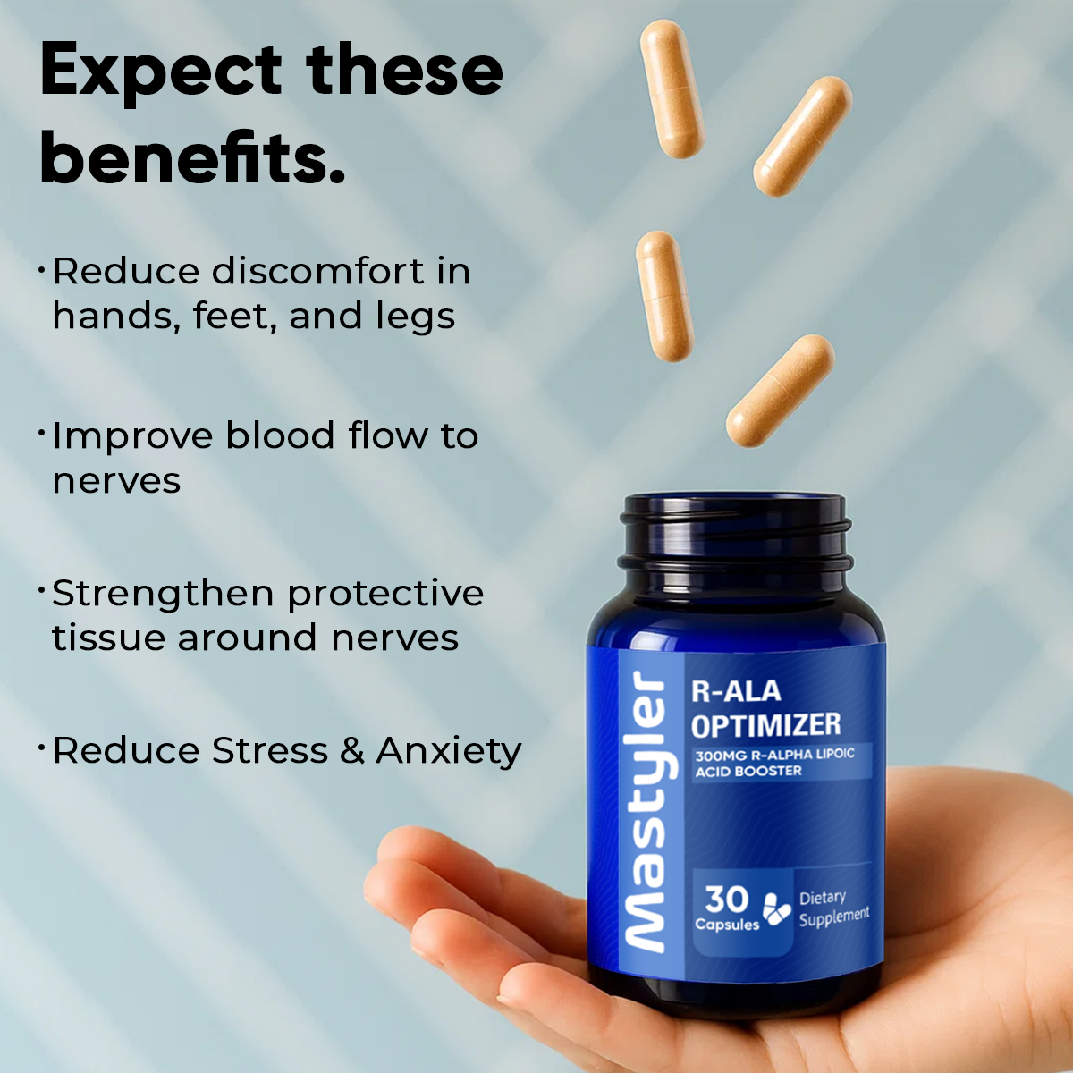 Scientists have recently discovered that patients who took 600mg of R-Alpha Lipoic Acid per day reported a dramatic increase in nerve health & function.* When you take Mastyler Optimizer® together with Mastyler®, you get a combined 600mg of R-ALA for maximum effect.