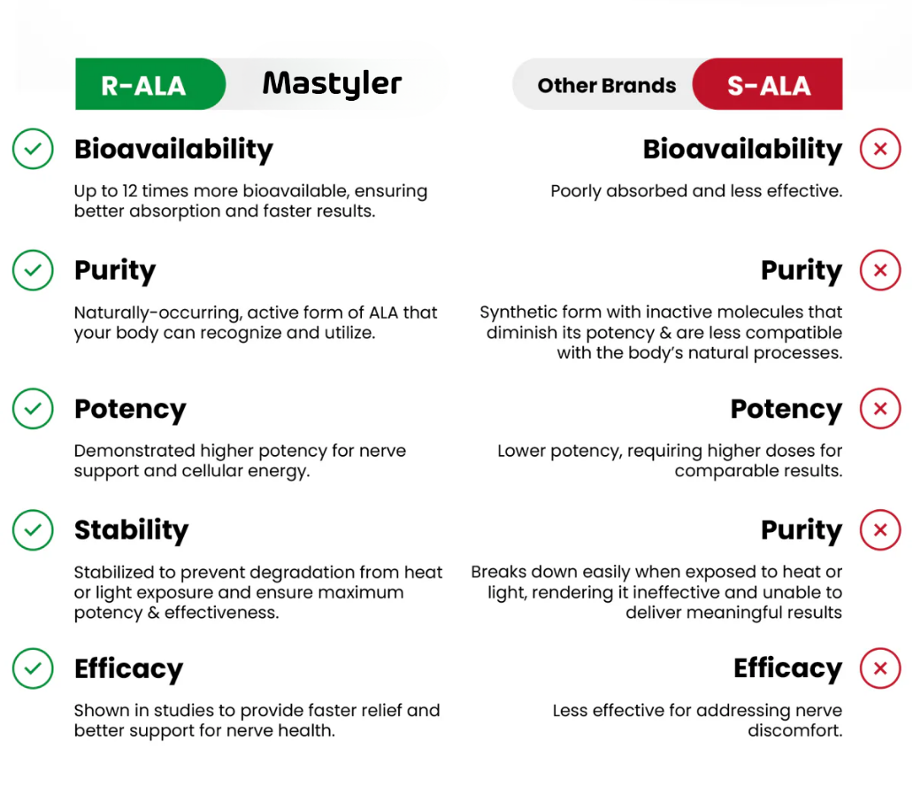 Most nerve supplements use a form of Alpha Lipoic Acid known as S-ALA. Created in a lab, it’s cheaper to produce - but that comes at a cost. Researchers have found that S-ALA is not as easily absorbed into your body, and may even inhibit the nerve- supportive properties of natural Alpha Lipoic Acid. Which is why we use only naturally sourced R-Alpha Lipoic Acid in our products - so you’re getting the most potent and proven form.